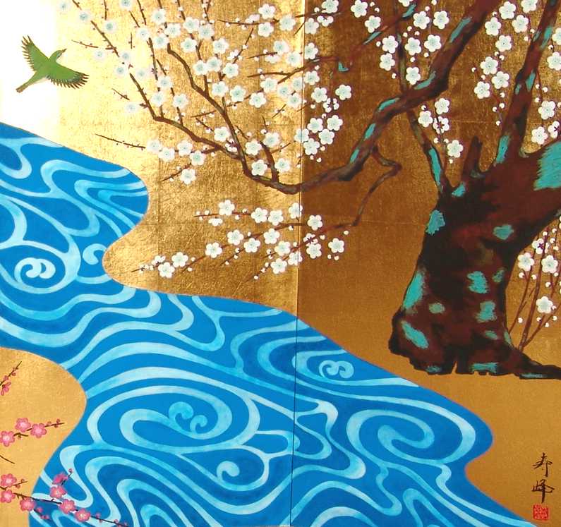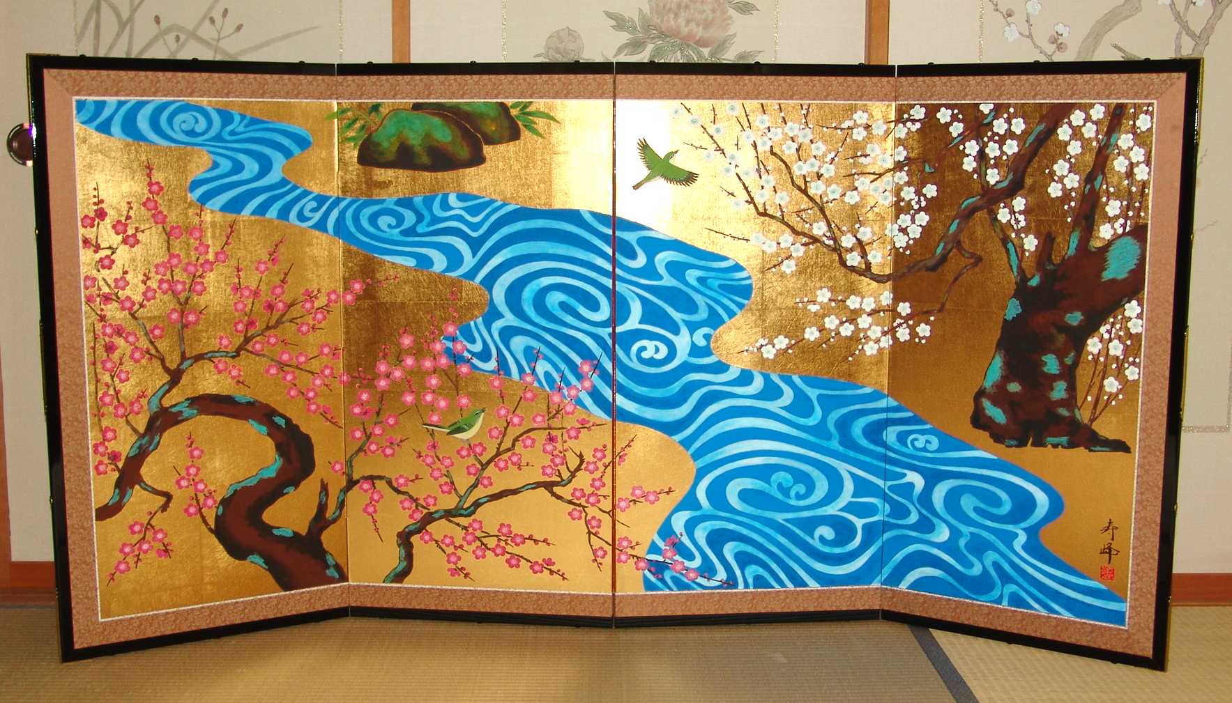 商品番号: X-154  金屏風 梅と流水 (富永寿峰先生) 定価(税込み):254,400円