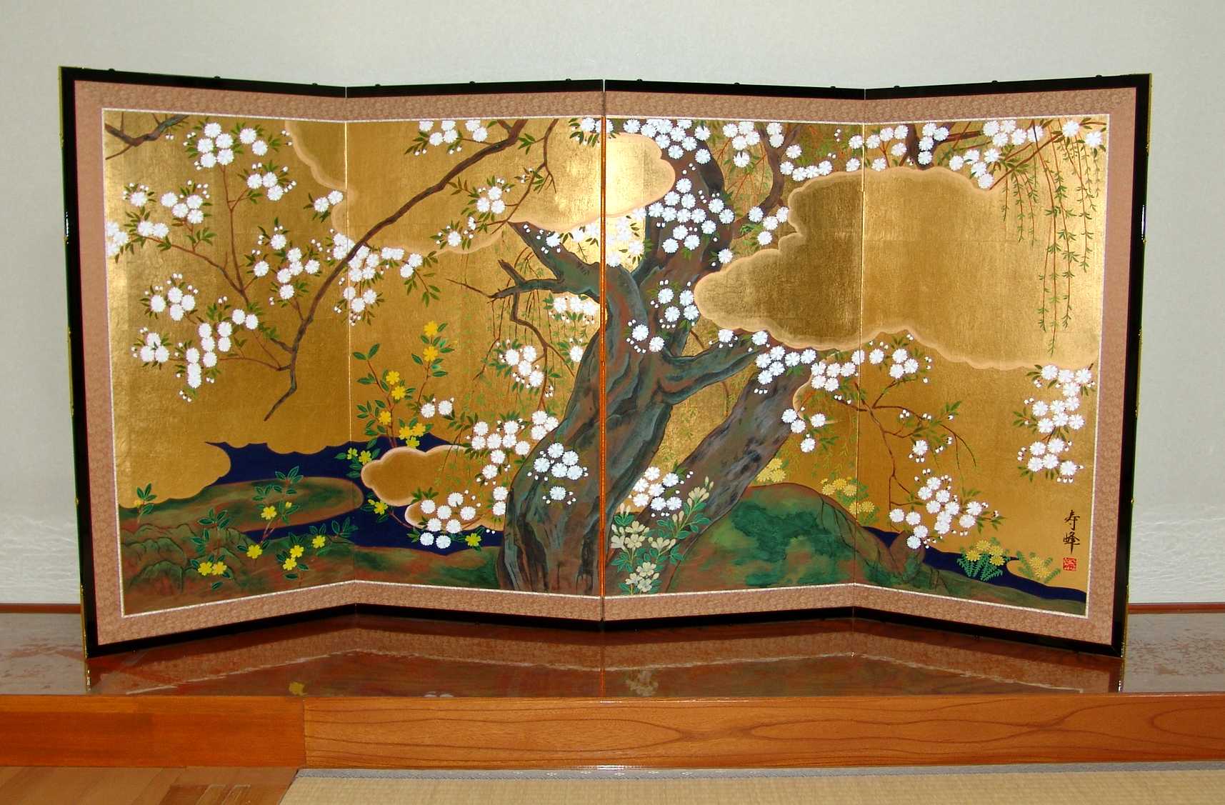 金屏風 日本画金屏風絵 の通販(通信販売)/製造 御子柴屏風店 金箔の上に肉筆にて日本画 金屏風 絵が描かれております。信州より名品を製造直販売いたします。商品一覧は下へスクロール。